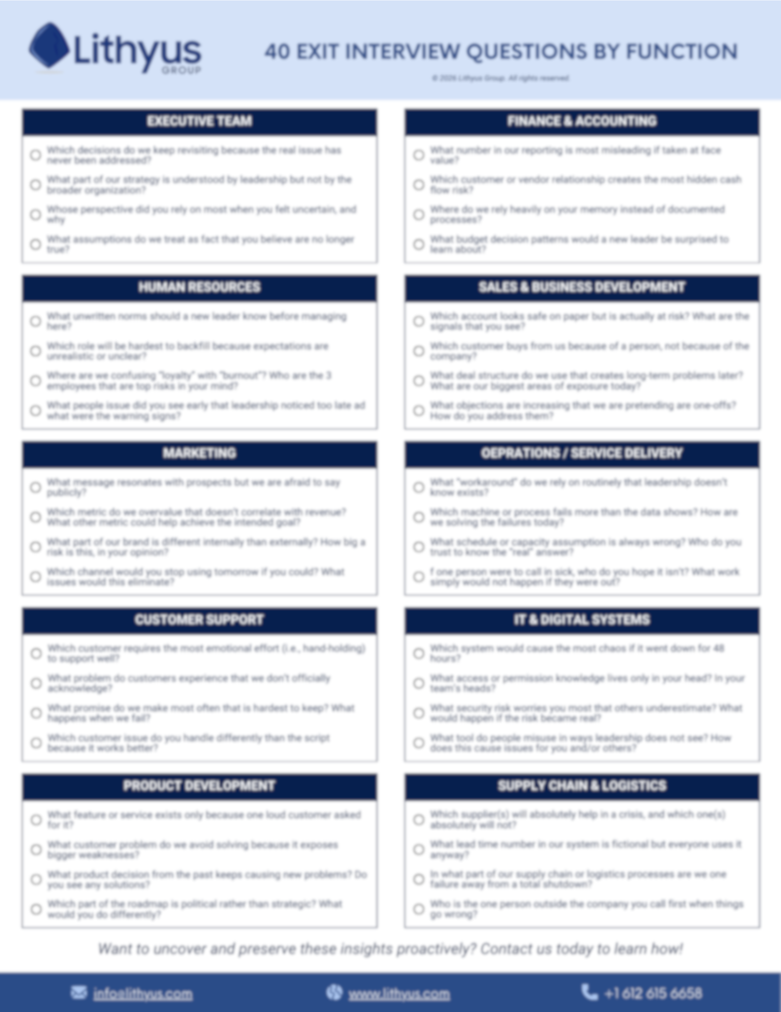 The Exit Interview is often the last opportunity you have to learn from an employee. Use these 40 questions, grouped by functional area, to dig deeper and uncover your departing team member’s expertise.
